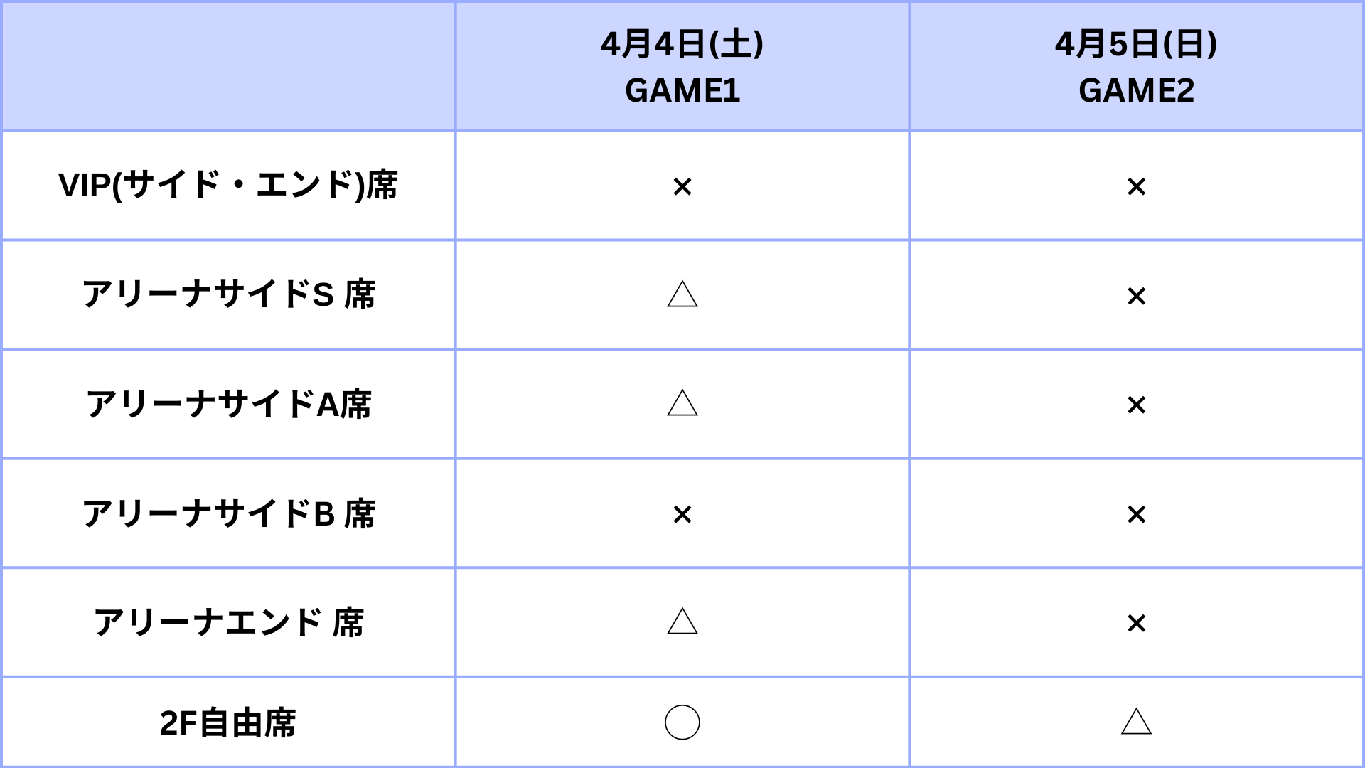◯:残席あり、△:残席わずか、×:完売